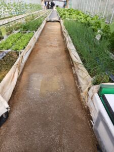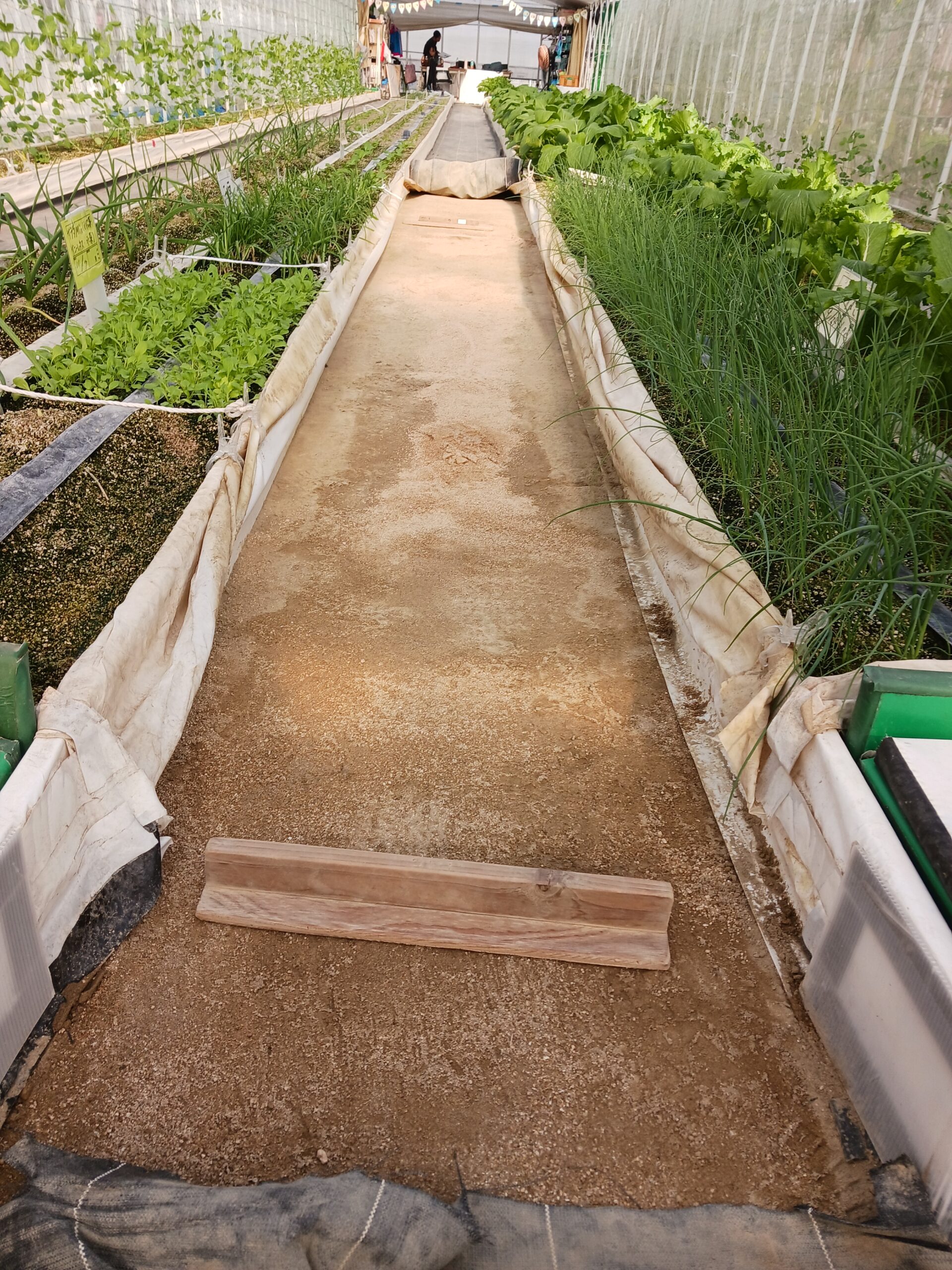 2025.12.01 補修中 ご無沙汰しています。 皆さんお元気ですか? 暑いと言っていたのが嘘のよう。今日から12月です。 今年の夏は暑すぎて、お野菜もダウンしてしまったのですが。 ようやく少しずつ、回復して来ました。 さて、ファームは今中央通路のメンテナンス中です。 ちょっと凸凹がひどかったので、 シート剥がして、土入れて、水を撒いて固めます。 来週くらいには完成するかな?